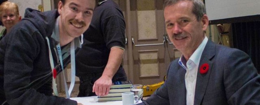 RAC Sound and Recording graduate, recording engineer Luke Leveille and Canada’s “singing astronaut” Colonel Chris Hadfield addressed a conference of 500 school counselors this month in Toronto. On November 10, 2014 the Ontario School Counselors Association (OSCA) hosted its annual conference at the International Plaza in Toronto. This OSCA conference was titled Creating Pathways to Success. Luke spoke first, relating his experience growing up in a small town in Ontario and always dreaming of a career in music. He moved to Toronto and attended RAC. Upon graduation from RAC, Luke went on to intern at Phase One Studios,which, after much work, landed him a position at Noble Street Studios as an assistant engineer. Luke has worked on recording projects for Drake, Wiley and The Weeknd as well as many others. When asked about what he most valued from his education at RAC, Luke says “RAC provided great practical experience for all the fundamentals. I didn’t really know how a compressor or signal flow worked until I came to RAC and was taught properly. The key was having it all spelled out and getting a professional perspective on the fundamentals”. Luke’s advice to young audio professionals on how to make your way in the Music Industry is that “Music has to be front and centre in every decision you make. When you commit to it, you’ve got to keep doing it. Keeping at it is the most important thing”.